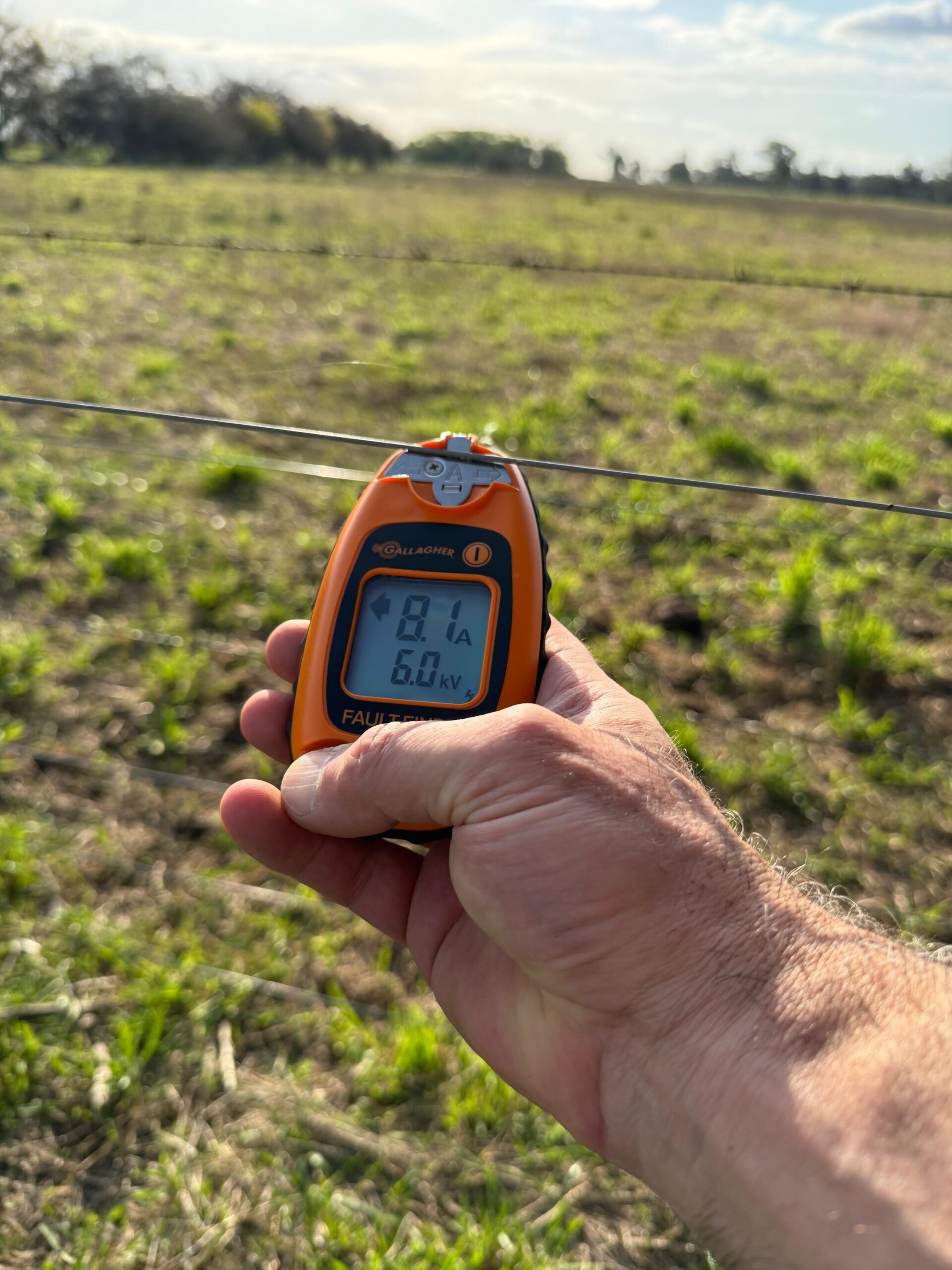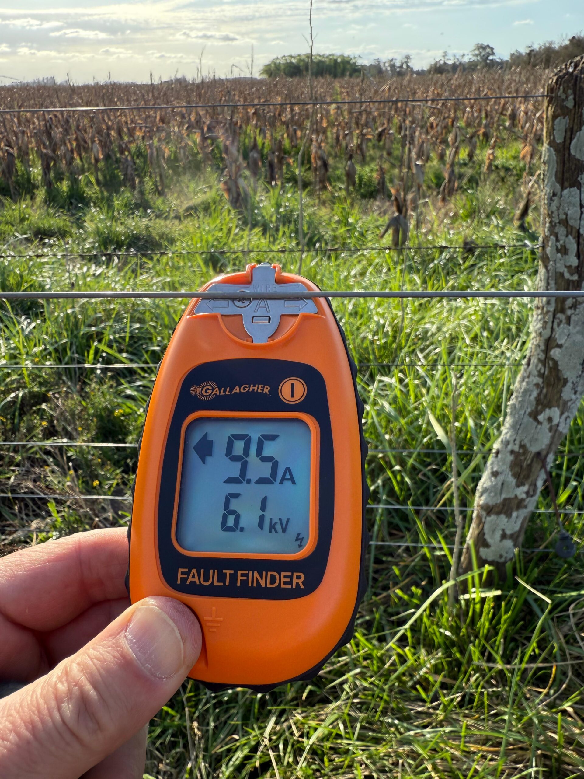Detector de fallas portátil que mide voltaje y corriente, e indica la dirección del problema. Ideal para revisar cercos en poco tiempo.